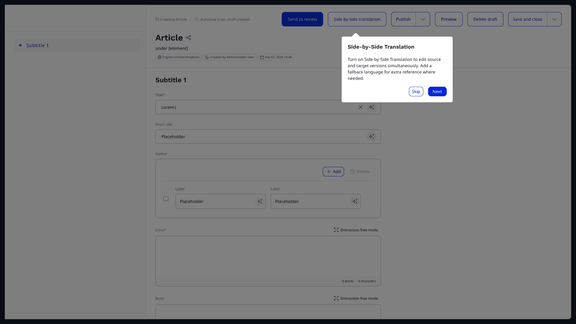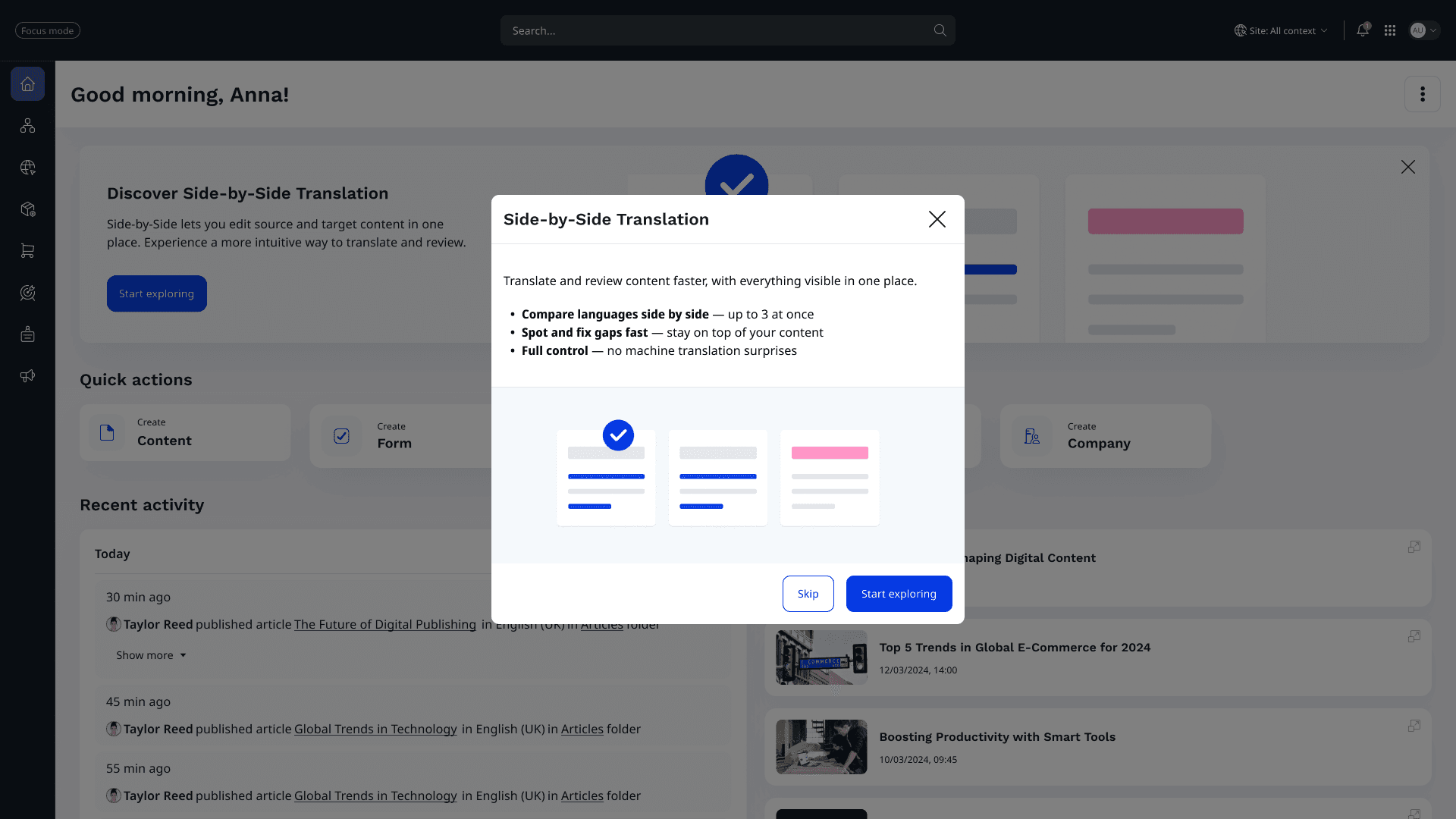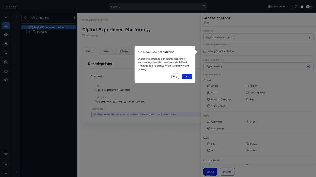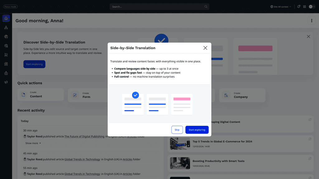 Creating a side-by-side translation feature for a CMS, enabling editors and content authors to view and edit source and target languages simultaneously. The goal was to streamline multilingual content management, reduce translation errors, and ensure a smooth, accessible editing experience.