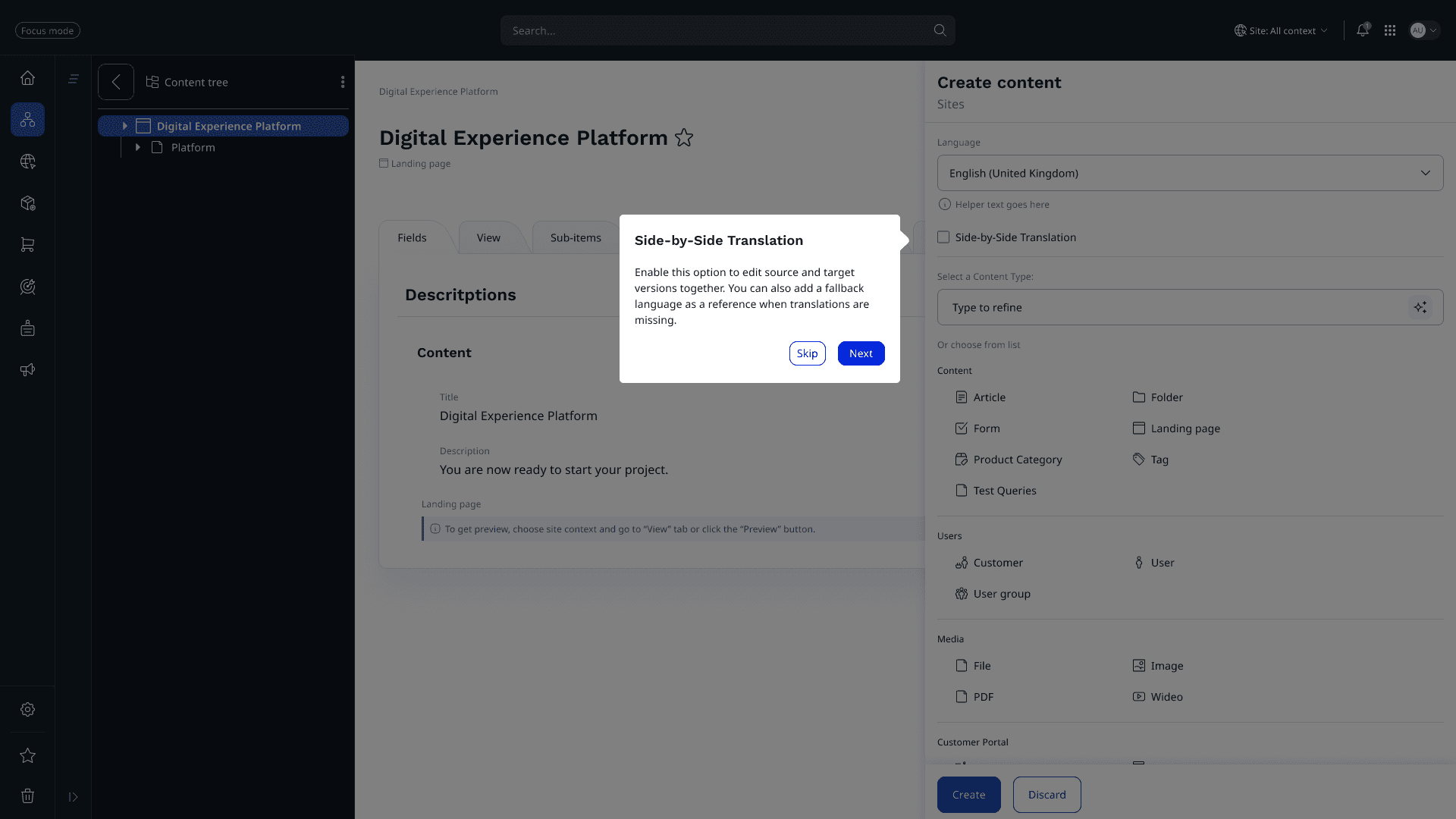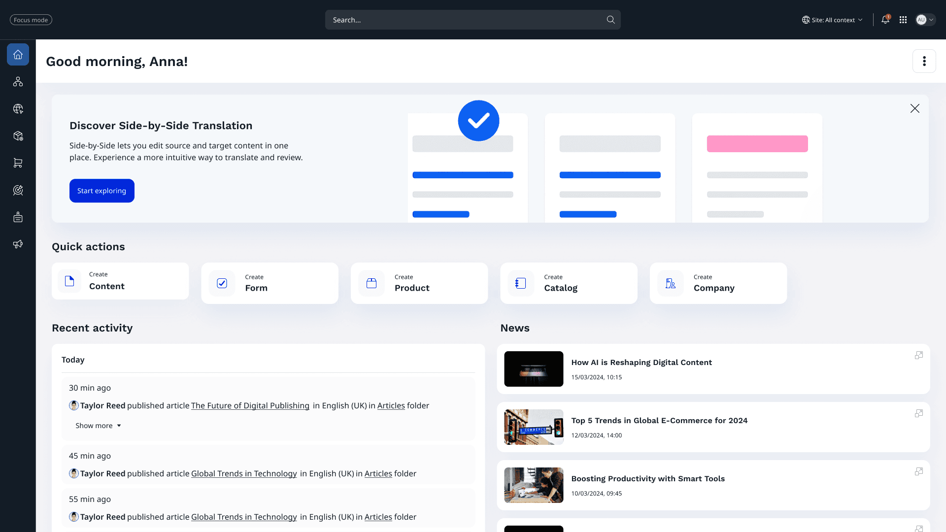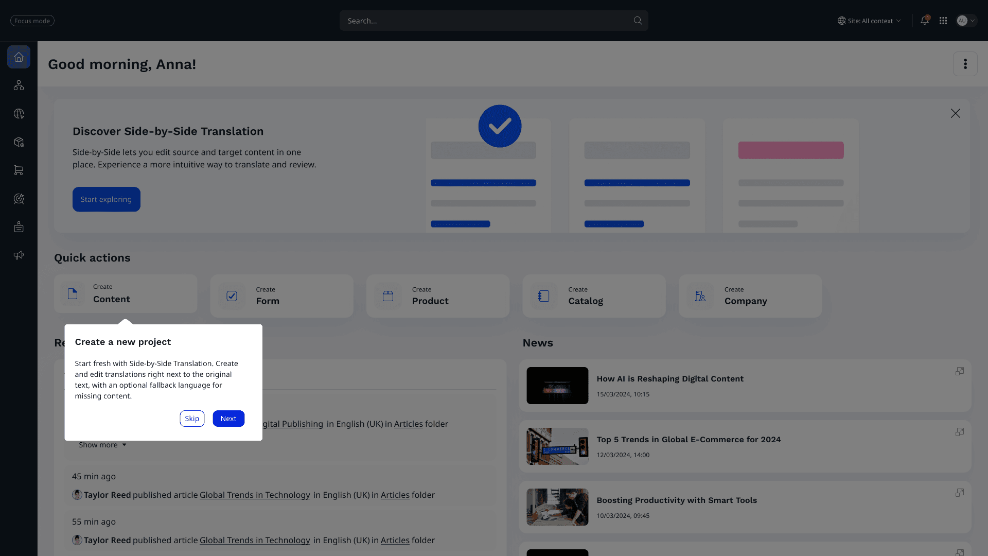 Creating a side-by-side translation feature for a CMS, enabling editors and content authors to view and edit source and target languages simultaneously. The goal was to streamline multilingual content management, reduce translation errors, and ensure a smooth, accessible editing experience.